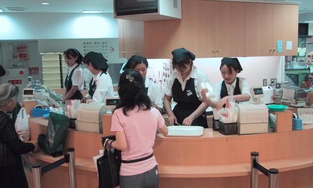 Look at all those uniformed cashiers lined up in a row behind the counter. The bottom floor of the Takashimaya mall is a "food floor" with bakeries, produce, fresh and prepared meats, and lots of other edible stuff. I was just intrigued by the number of almost identical looking cashiers behind this particular counter...