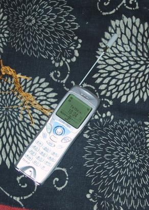 This was my phone in Japan, a light, tiny, pre-paid inexpensive cellular phone Fuyuko bought for me. I left it on "vibrate" mode all the time (because I had no idea of how to go about switching the ring to any other mode, not that I would have wanted to anyway), which it indicated with an icon of a cute smiley face with eyes closed. My phone here in the USA just says "Silent"... why no cute icons? In fact, icons aside, cell phone technology in Japan seems years ahead of that here. Fuyuko's phone is just as small and light as this, has a vivid color display with animated cartoon characters hopping around, and the ringtones are not "monophonous" (only one note playing at a time) or "monovolumate" (each note has a constant loudness). I.e., when her phone rings it sounds a whole lot more like music than beeping. That was last year's model... Why is the rest of the world so far behind the times?